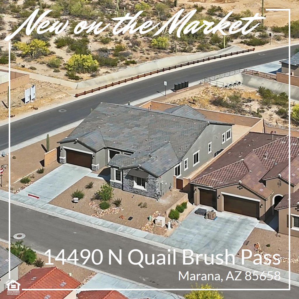 Tour this stunning Hanford home at Saguaro Reserve in Dove Mountain Marana! 2,980 sq ft, 3 bed, 3 bath, 2 car garage with contemporary fireplace, multi-slide patio doors, professional kitchen with center island, walk-in pantry, quartz countertops and white cabinetry. Primary suite features private patio door and spacious walk-in closet.